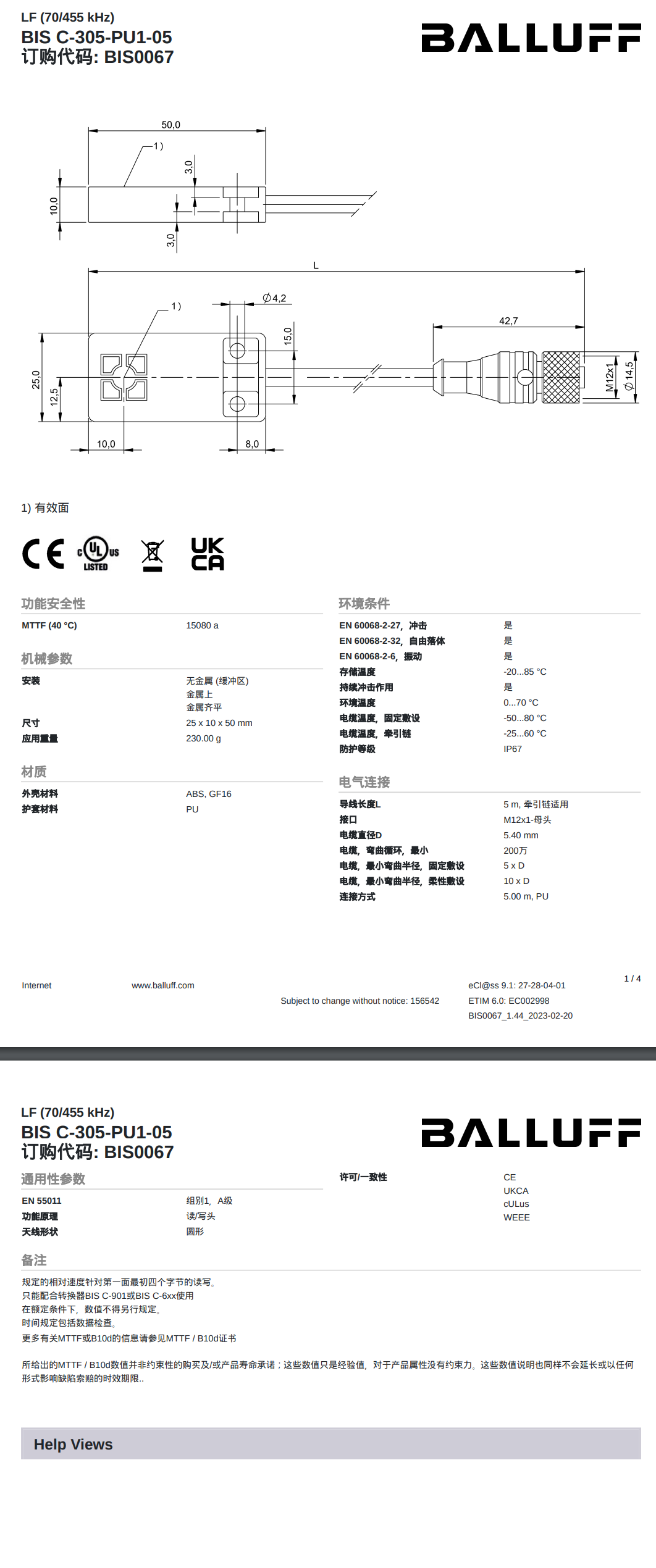 BIS0067 BIS C-305-PU1-05 BALLUFF巴鲁夫 低频读/写头和天线 (70/455 kHz)