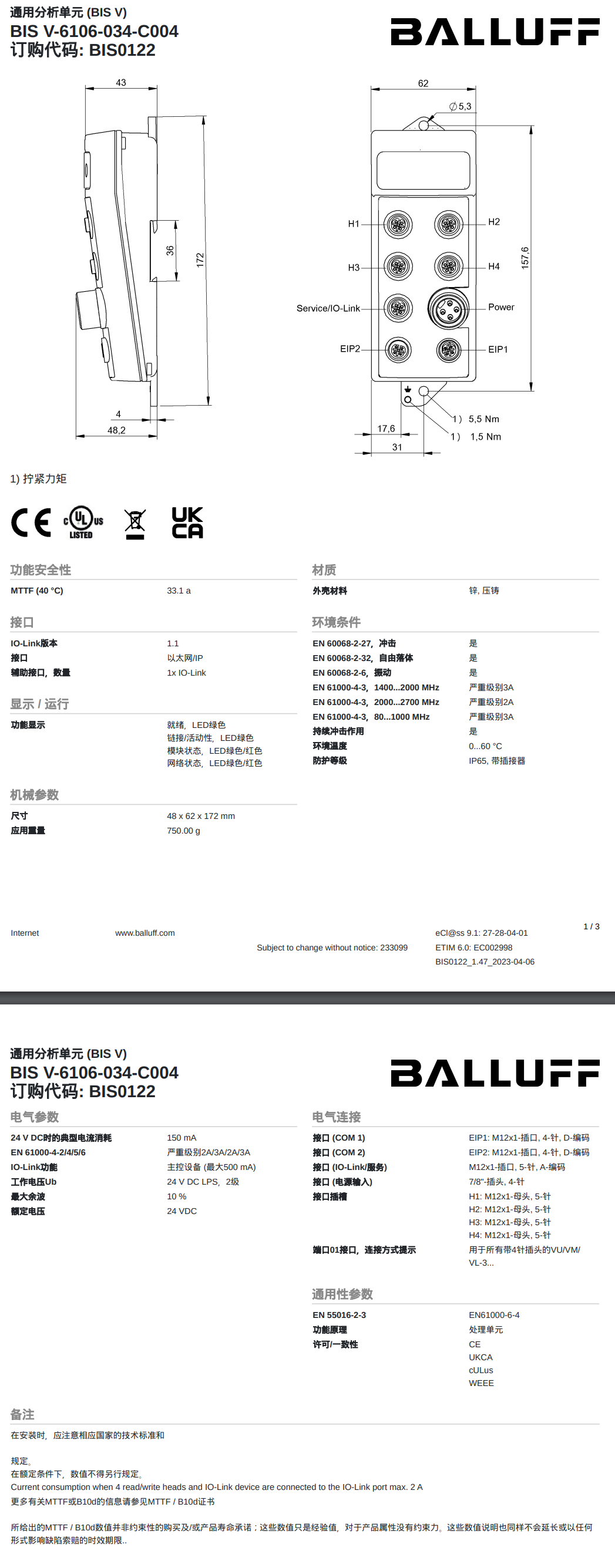 BIS0122 BIS V-6106-034-C004 BALLUFF巴鲁夫 高频处理单元 (13.56 MHz)
