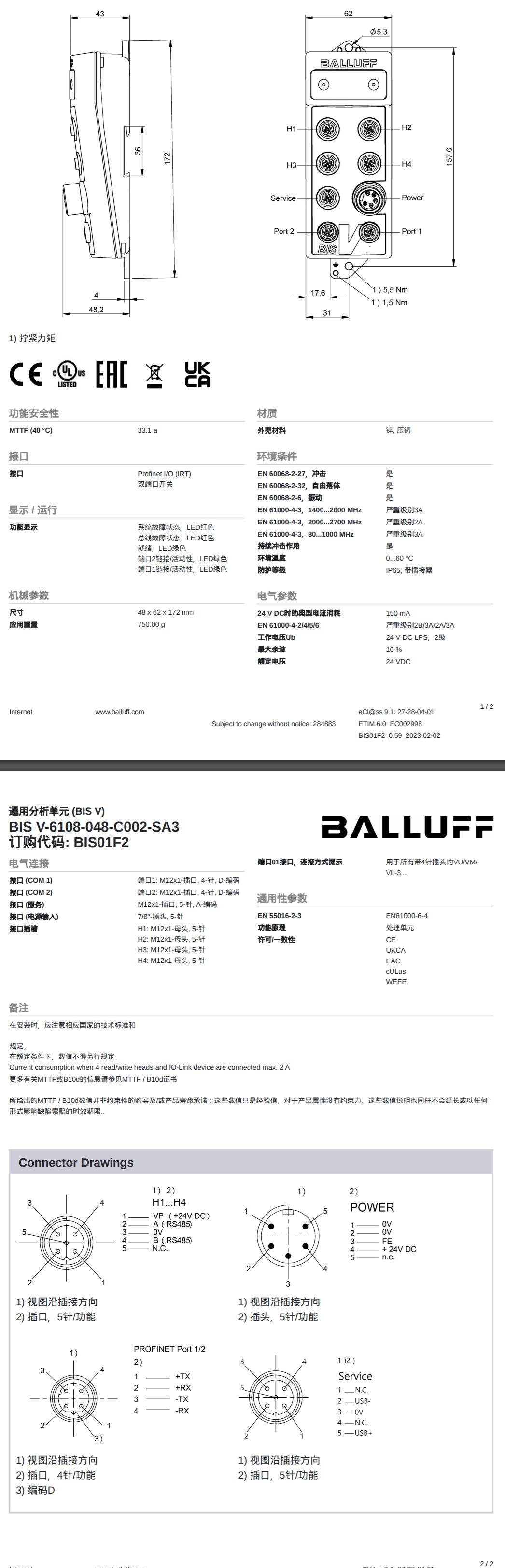 BIS01F2 BIS V-6108-048-C002-SA3 BALLUFF巴鲁夫 高频处理单元 (13.56 MHz)
